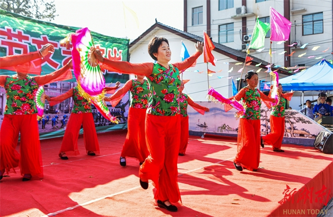Villagers stage art performances at Daxing Village, Danqing Town, Jishou City on October 9. The village hosted a public art performance themed "celebrate bumper harvest, showcase a new look" on that day. Art troupes from the village and neighboring villages presented 56 self-choreographed programmes, including square dances, folk song performances, and intangible cultural heritage shows. The event conveyed people's joy of harvest and highlighted the prosperous, fulfilled, and positive spirit of farmers in the new era. (Photo/Yao Fang and Zhang Deping)