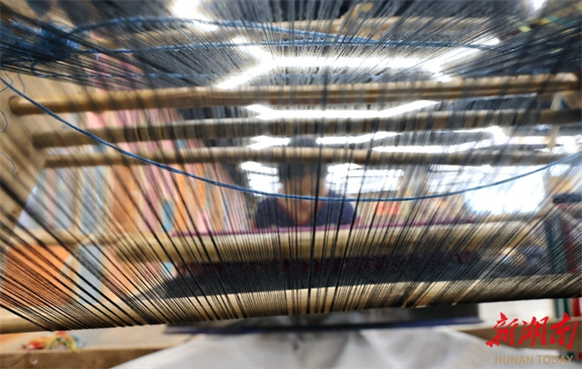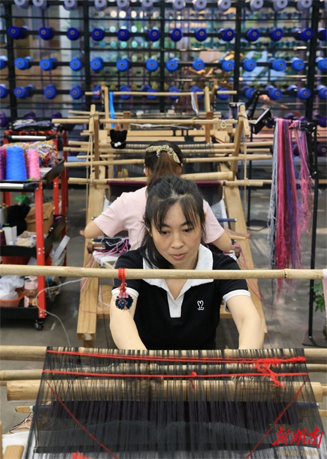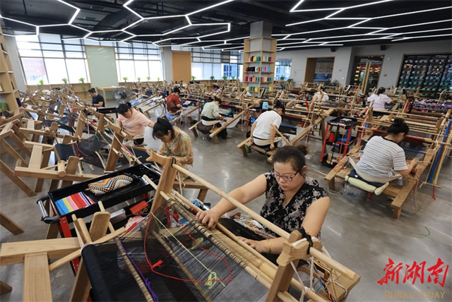 The photo shows workers creating Tujia brocade products at a Tujia brocade production and R&D base in Zhangjiajie City. To meet autumn and winter market demand, Tujia brocade enterprises across the city are actively innovating product designs, launching customized products such as double-sided brocade shawls and scarves. Companies are operating at full capacity to fulfill orders, ensuring timely supply of new products. (Photo/Wu Yongbing)