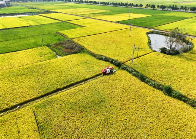 An aerial drone photo taken on Oct. 11, 2025 shows a harvester working at a field in Yangquan Town, Changning City, central China's Hunan Province. [Photo/Xinhua]