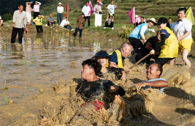 On October 10, the 2025 Shanbei Terraced Fields Farming Culture Competition was held in Shanbei Village, Gezhuping Town, Xupu County. The event integrated elements of traditional farming, ethnic culture, and modern competition. It featured distinctive activities like "Threshing Race," and "Sprint Race in the Mud," attracting many visitors. The photo shows a tug-of-war game in a rice paddy. (Photo/Lei Wenlu and Chen Dasen)