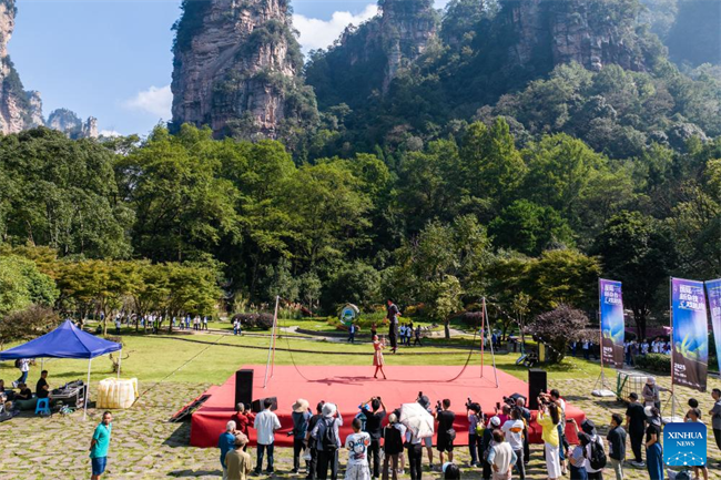An acrobat from Russia performs during the 2025 Zhangjiajie International New Acrobatic Theater Festival at the Zhangjiajie National Forest Park in Zhangjiajie, central China's Hunan Province, Oct. 11, 2025. The event kicked off in Zhangjiajie on Saturday, with the participation of acrobats from more than ten countries and regions including France, Russia, Germany, Italy, and Chile. Over 60 shows will be presented during the five-day event, integrating elements of drama, dance, music, and new media. (Xinhua/Chen Sihan)