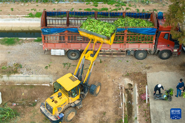 The aerial photo shows a villager operating a loader to transfer freshly harvested sweet corns onto a truck in Xin'an Village, Huage Town, Nanxian County. (Photo/Chen Sihan)