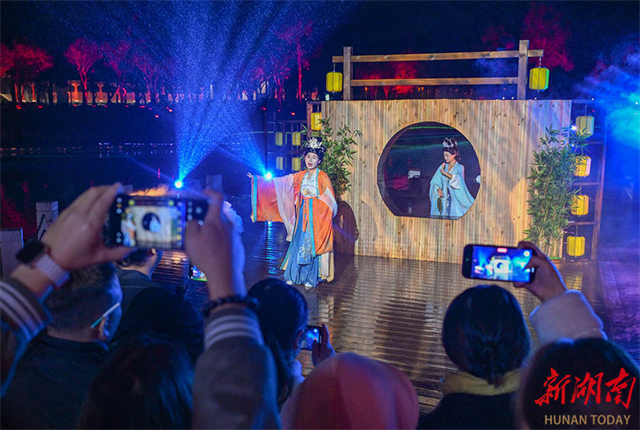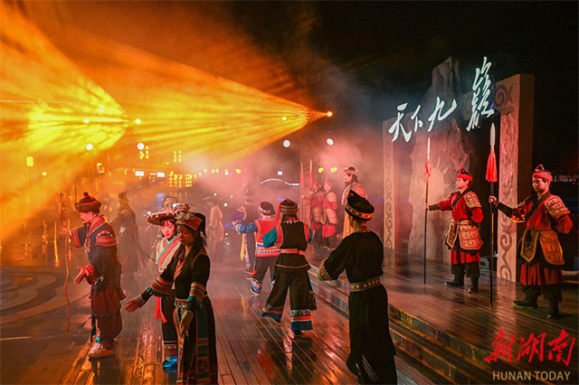 On the evening of October 22, a grand real-scene performance themed Jiuyi Mountain was staged at the Nanfengji Cultural Tourism Commercial Complex in Jiuyi Mountain Scenic Area, Ningyuan County, attracting crowds of visitors. In recent years, the scenic area has centered on the culture of Emperor Shun to innovatively interpret traditional culture through technological means. It has created immersive cultural and tourism experiences to boost the deep integration of the cultural and tourism industries. (Photo/Guo Liliang and Tong Zhenxi, Hunan Daily)