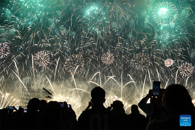 People enjoy a firework show in Liuyang City, central China's Hunan Province, Oct. 24, 2025. The opening ceremony of the 17th Liuyang Fireworks Cultural Festival was held here on Friday. Liuyang is well-known for its fireworks industry. (Xinhua/Chen Zhenhai)