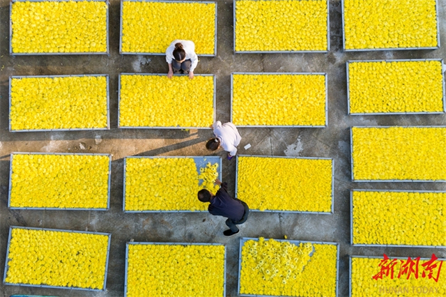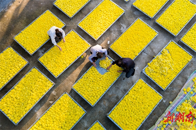 On November 4, farmers dry golden chrysanthemums at a plantation in Huangli Village, Huquan Town, Lianyuan City. In recent years, the city has revitalized land resources by adopting a "company-plantation-farmer" model to develop the golden chrysanthemum industry. It has established online and offline sales platforms to integrate production and marketing, thereby effectively boosting employment and incomes for local farmers. (Photo/Wu Yonghua)
