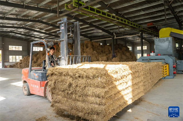 The photo, taken on November 5, shows a worker arranging processed straw feed at a workshop of Changsha Xuanfan Agricultural Development Co., Ltd. in Kaihui Town, Changsha County. (Photo/Chen Sihan, Xinhua)