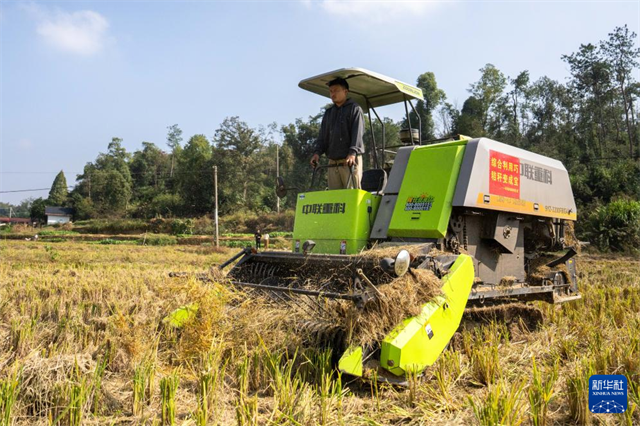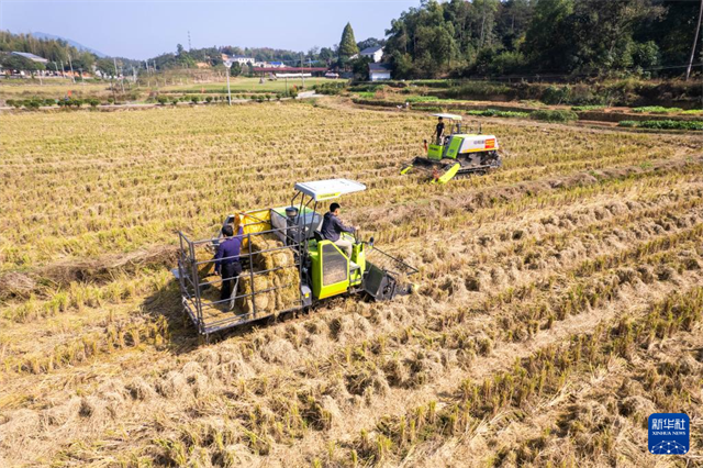 The aerial photo, taken on November 5, shows a villager operating a self-propelled straw baler to collect crop straw in Kaihui Village, Kaihui Town, Changsha County. (Photo/Chen Sihan, Xinhua)