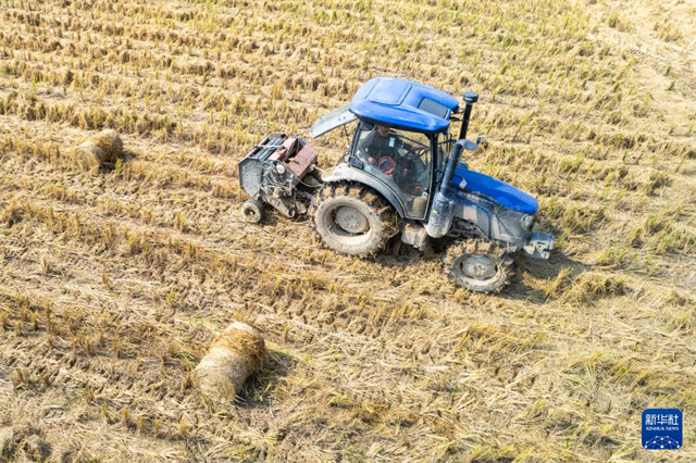 The aerial photo, taken on November 5, shows a villager operating a straw baler to collect crop straw in Kaihui Village, Kaihui Town, Changsha County. (Photo/Chen Sihan, Xinhua)