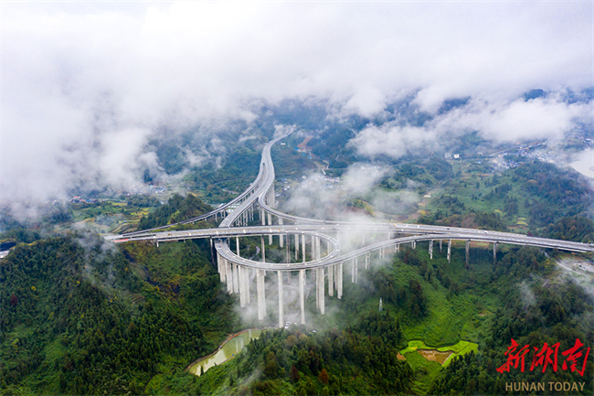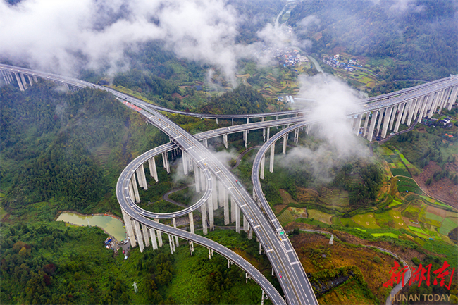 The photo, taken on November 10, shows expressways intersecting at the Shijiazhai Interchange in Shijiachong Neighborhood, Jishou City. The expressways pass through mist-shrouded valleys and mountains, hidden from view sometimes, making a majestic scene. (Photo/Liu Zhenjun)