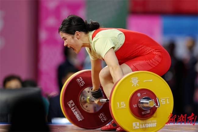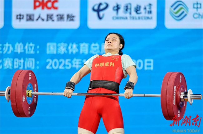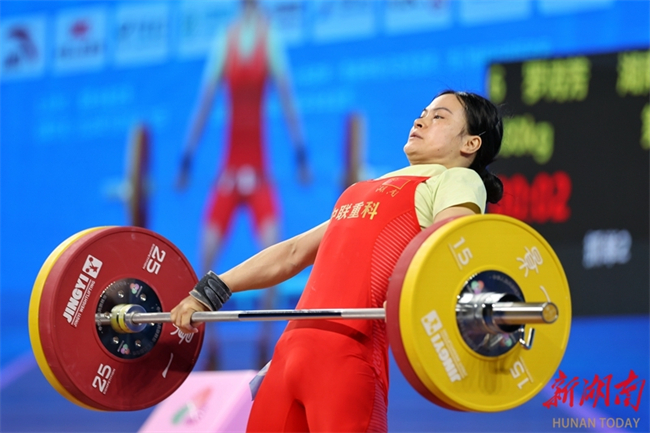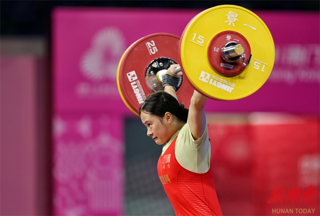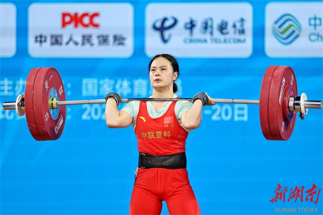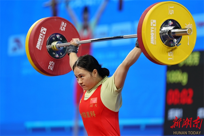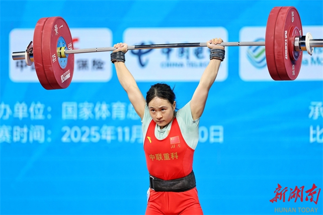 Luo Shifang, a weightlifting champion in the Paris 2024 Olympic Games and a member of the Zoomlion-supported Hunan Weightlifting Team, claimed the gold medal in the weightlifting women's 59kg final at China's 15th National Games on the evening of November 11. She lifted 105kg in the snatch and 130kg in the clean and jerk, achieving a winning total of 235kg. (Photo/Fu Cong, Hunan Daily)