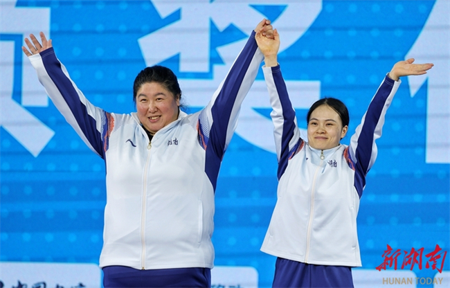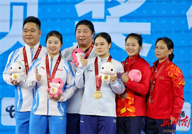 Luo Shifang (M), a weightlifting champion in the Paris 2024 Olympic Games and a member of the Zoomlion-supported Hunan Weightlifting Team, claimed the gold medal in the weightlifting women's 59kg final at China's 15th National Games on the evening of November 11. She lifted 105kg in the snatch and 130kg in the clean and jerk, achieving a winning total of 235kg. (Photo/Fu Cong, Hunan Daily)
