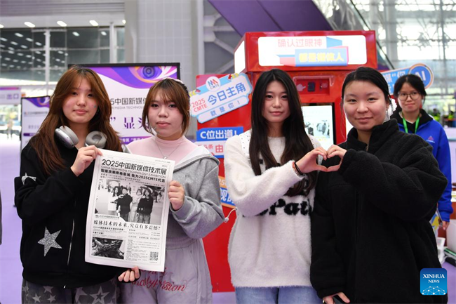 People pose for photos during the 2025 China New Media Technology Exhibition in Changsha, capital of central China's Hunan Province, Nov. 12, 2025. The 2025 China New Media Conference, featuring an opening ceremony, 7 parallel forums, China New Media Technology Exhibition and 5 other events, kicked off here on Wednesday. (Xinhua/Chen Zhenhai)