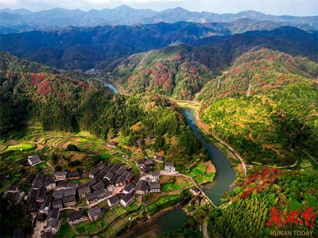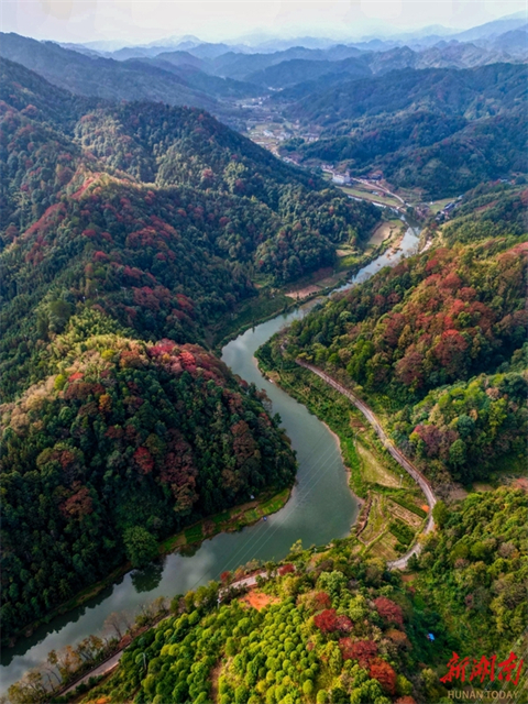 The photo above, taken on November 12, shows a breathtaking late-autumn scene in Hongxiang Village, Shuangjiang Town, Tongdao Dong Autonomous County. The vibrant crimson leaves, green mountains, pristine waters, and scattered dwellings in the secluded valley constitute a painting scroll. (Photo/Yin Xuping)