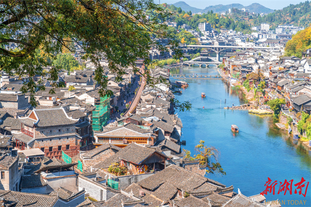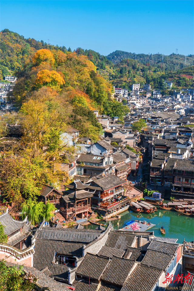 The photo shows tourists enjoying a boat tour on the Tuojiang River at Fenghuang Ancient Town. Bathed in the winter sun, the clear water and the vibrant red and yellow foliage along the banks form a delightful contrast, immersing the ancient town in a serene early-winter beauty that captivates many visitors. (Photo/Liang Yonghong)
