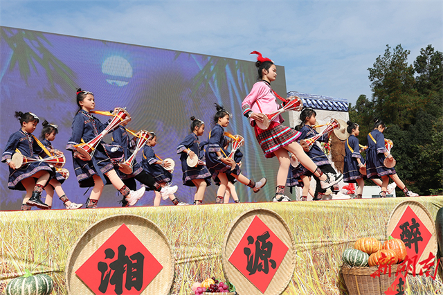 On November 17, pupils of the Xiyao Township Central Primary School performed a dance show in Taoyuanping Village, Xishan Yao Township, Linwu County, Chenzhou City. The township authority held a folk event to celebrate a bumper harvest, showcasing the new look of the Yao ethnic township and the joy of the harvest through cultural performances and specialty product exhibitions. (Photo/Chen Weiping)