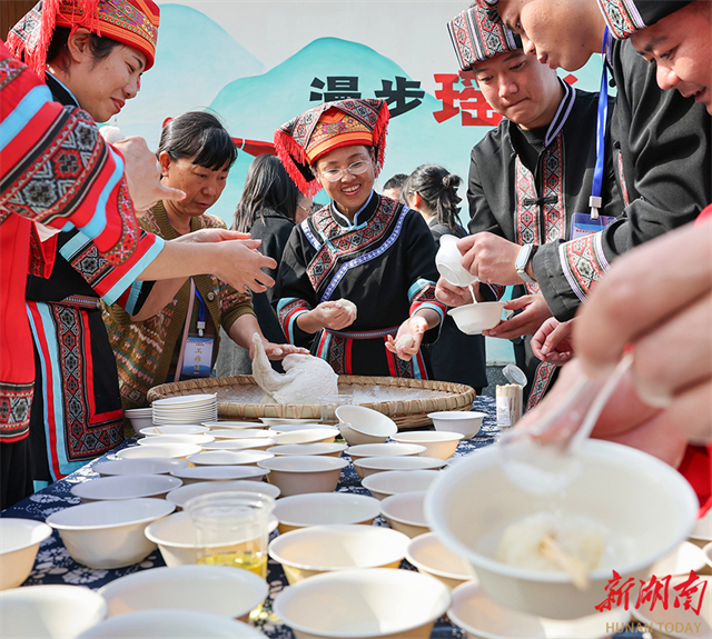 On November 17, villagers made ciba or glutinous rice cake in Taoyuanping Village, Xishan Yao Township, Linwu County, Chenzhou City. The township authority held a folk event to celebrate a bumper harvest, showcasing the new look of the Yao ethnic township and the joy of the harvest through cultural performances and specialty product exhibitions. (Photo/Chen Weiping)