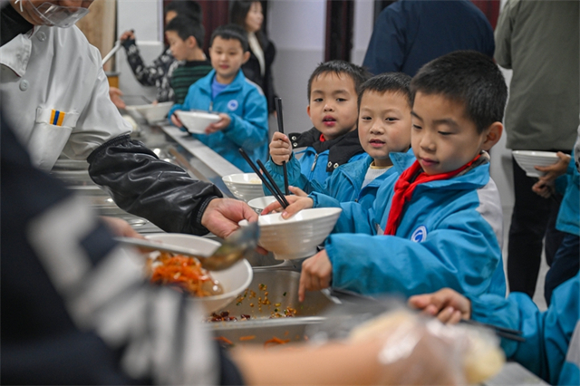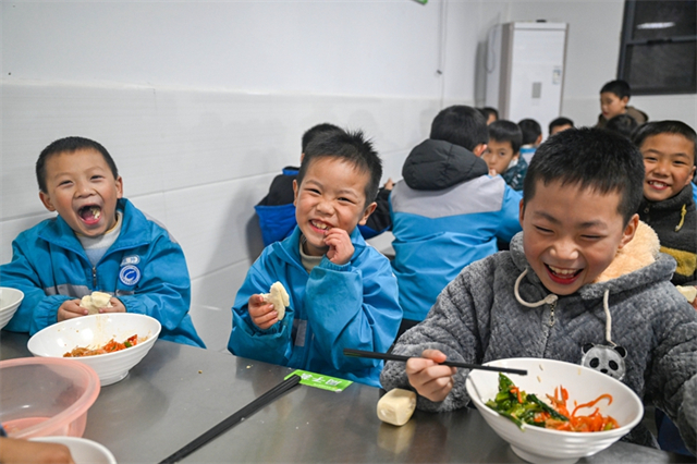 On November 18, children have a meal in the dining hall at Hanshou County Care Center. In recent years, the county authority has pioneered seven major initiatives for public welfare: free public parking, greening initiatives for government and public buildings (excluding schools), full-process agency services for business approvals and government affairs, home-delivered medical care and medication for special patients like those with mental illnesses, complimentary lunches and dinners for seniors aged 80 and above, daily free milk and eggs for students from five categories of disadvantaged families, and centralized care for vulnerable children. These initiatives have comprehensively enhanced government efficiency, continuously improving the people's sense of gain and happiness. (Photo/Guo Liliang and Lu Rongbing, Hunan Daily)