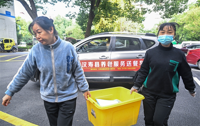 On November 18, staff from Hanshou County's elderly care center provides a lunch delivery service for a community care center. (Photo/Guo Liliang and Lu Rongbing, Hunan Daily)