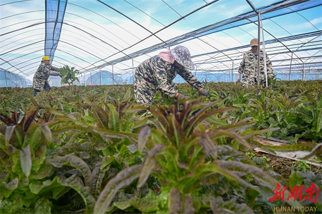 Farmers harvest vegetables at a vegetable planting cooperative in Hanshou County. In recent years, the county authority has further advanced the transformation and upgrading of its vegetable industry, comprehensively aligning with the Vegetable Basket Project or Non-Staple Food Project for the Guangdong-Hong Kong-Macao Greater Bay Area, to build the "Hanshou Vegetables" brand. Currently, Hanshou County maintains a year-round vegetable cultivation area of over 450,000 mu (approximately 30,000 hectares), with an annual output of 1.8 million tonnes and a comprehensive output value exceeding 7.5 billion CNY. This initiative effectively connects plantations directly to consumers, allowing vegetables to reach the market without delay and directly boosting farmers' incomes. (Photo/Guo Liliang and Lu Rongbing, Hunan Daily)