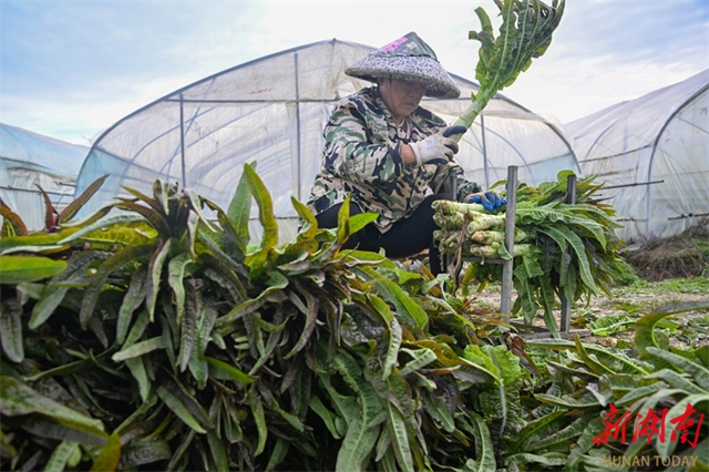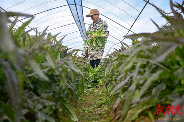 A farmer harvests vegetables at a vegetable planting cooperative in Hanshou County. In recent years, the county authority has further advanced the transformation and upgrading of its vegetable industry, comprehensively aligning with the Vegetable Basket Project or Non-Staple Food Project for the Guangdong-Hong Kong-Macao Greater Bay Area, to build the "Hanshou Vegetables" brand. Currently, Hanshou County maintains a year-round vegetable cultivation area of over 450,000 mu (approximately 30,000 hectares), with an annual output of 1.8 million tonnes and a comprehensive output value exceeding 7.5 billion CNY. This initiative effectively connects plantations directly to consumers, allowing vegetables to reach the market without delay and directly boosting farmers' incomes. (Photo/Guo Liliang and Lu Rongbing, Hunan Daily)