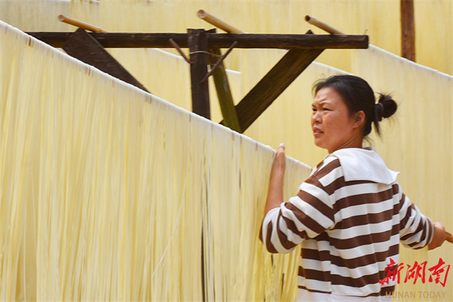 On November 23, villagers are busy drying traditional handmade noodles in Nanshi Village, Nanshi Town, Lanshan County. In recent years, the town authority has led a modernization drive, boosting over 30 noodle workshops toward mechanized production through equipment upgrading and technological innovation. These efforts have brought new life into the traditional industry and effectively increase villagers' income. (Photo/Huang Chuntao and Li Mei)