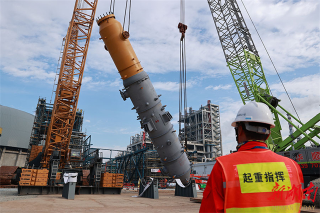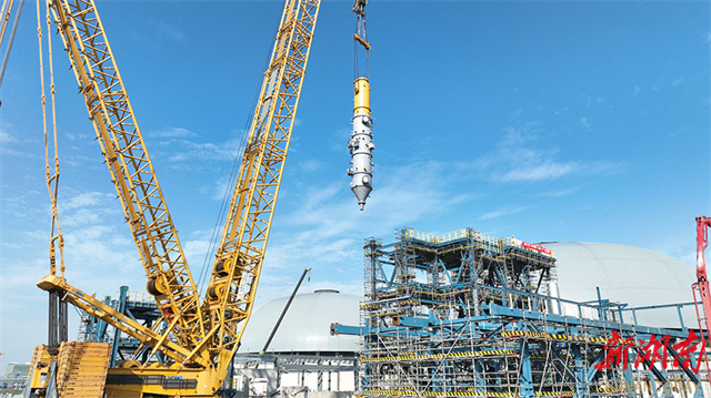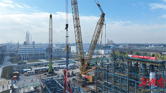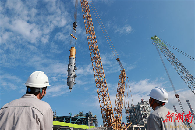 On November 24, the first 95-tonne large-scale equipment converter is hoisted into place for a biomass gasification flexible platform construction project of the SINOPEC Hunan Company. Currently, 80% of the steel structure for the project has been completed, with the gasification framework expected to be topped out by December 5. (Photo/Peng Zhan and Deng Jun)
