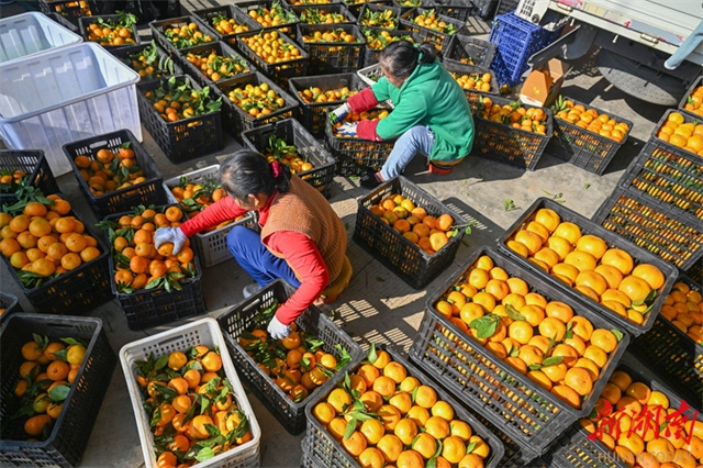 The photo, taken on November 25, shows villagers sorting citrus fruit for sales at Huangcao Town, Zixing City. This day marked the town's "Ganxu Day," where locals transported golden citrus fruit by boat for trade. The event drew numerous residents, tourists, and buyers, forming a distinctive "boat transport + market" production and marketing model. In recent years, the local authority has leveraged Dongjiang Lake's quality ecological resources to vigorously develop its citrus industry. As the core producing area, Huangcao Town has turned citrus fruit into a "golden industry" that drives income growth for local farmers. (Photo/Guo Liliang, Hunan Daily)