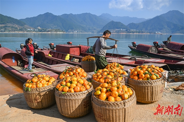 The photo, taken on November 25, shows villagers carrying citrus fruit with bamboo baskets and taking a boat to the local market at Dongjiang Lake Pier in Huangcao Town, Zixing City. This day marked the town's "Ganxu Day," where locals transported golden citrus fruit by boat for trade. The event drew numerous residents, tourists, and buyers, forming a distinctive "boat transport + market" production and marketing model. In recent years, the local authority has leveraged Dongjiang Lake's quality ecological resources to vigorously develop its citrus industry. As the core producing area, Huangcao Town has turned citrus fruit into a "golden industry" that drives income growth for local farmers. (Photo/Guo Liliang, Hunan Daily)