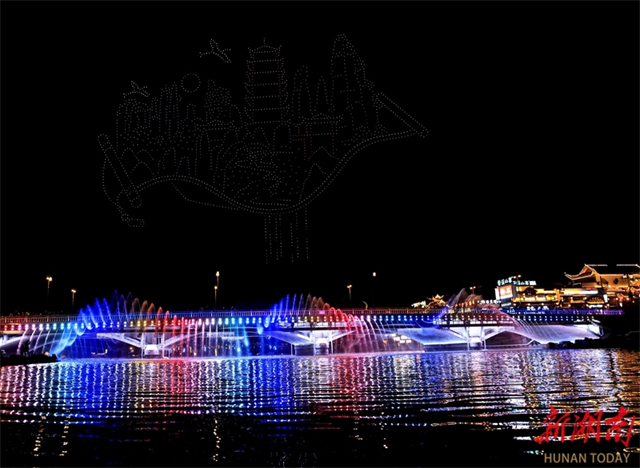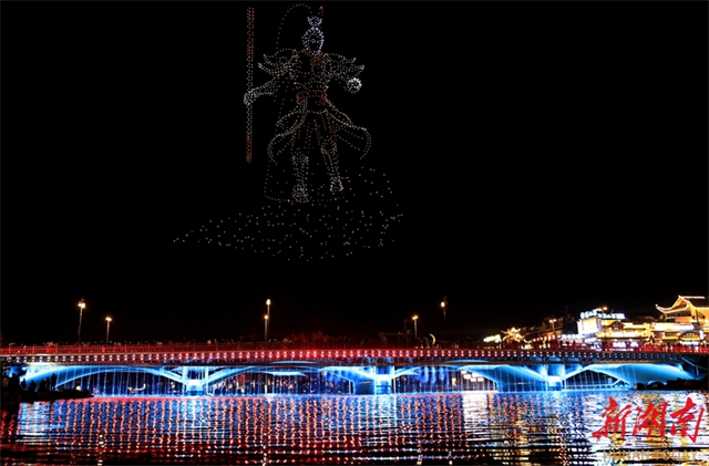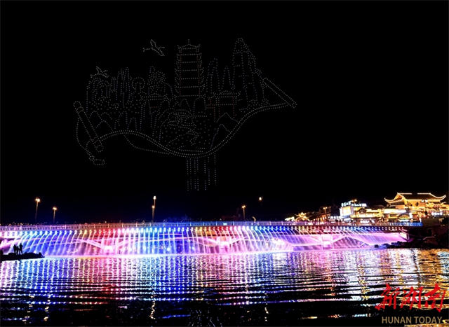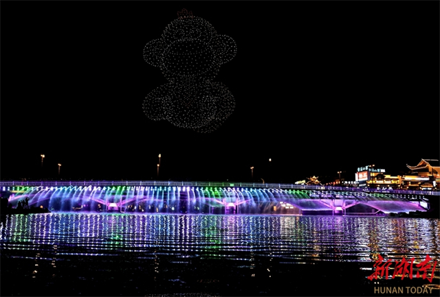 On the evening of November 25, a dazzling drone light show themed "Majestic Zhangjiajie, Mystical Wulingyuan" was held on the Suoxi River in Wulingyuan District, Zhangjiajie City. Two thousand drones flew in precise formation, sequentially projecting messages like "Welcome to Zhangjiajie," "Avatar," and "Tujia Baishou Dance." The distinctive patterns in the night sky attracted crowds of visitors. (Photo/Wu Yongbing)