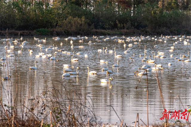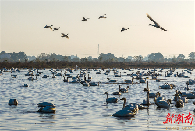 On November 25, tundra swans were seen flying, frolicking, and foraging on the Donggu Lake. As temperatures steadily dropped in winter season, approximately 3,000 Siberian swans have arrived at the Donggu Lake Wetland Park, a bird habitat in Qu Yuan Management Area, Yueyang City. In recent years, with wetland restoration projects yielding results, an increasing number of migratory birds have chosen to rest here, painting a harmonious ecological picture. (Photo/Cai Xiaoping)