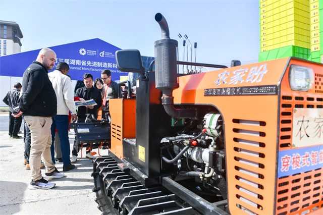 The photo shows foreign buyers discussing agricultural machinery procurement with exhibitors at the expo. (Photo/Wu Yonghua)