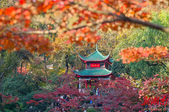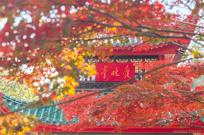 The photo, taken on November 30, shows the scenery of red maple leaves near the Aiwan Pavilion at the Yuelu Mountain Scenic Area, Changsha City. Maple leaves here have turned red, entering their best viewing period. Aiwan Pavilion, one of China's Four Famous Pavilions, is now surrounded by fiery red maples, creating a breathtaking scene that attracts numerous tourists. (Photo/Gu Pengbo, Hunan Daily)