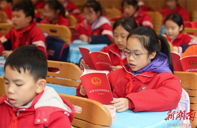 On December 3, students read booklets about the Constitution at Liya Primary School in Tongdao Dong Autonomous County, ahead of the 12th National Constitution Day which falls on December 4. Various activities are being held across Hunan Province to promote public awareness of the Constitution. (Photo/Su Yongzhu)