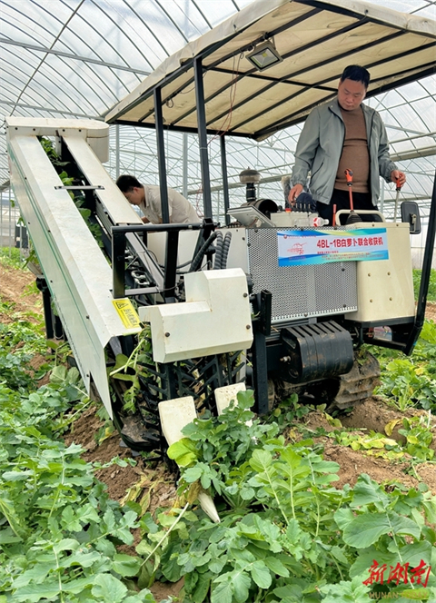 The photo above, taken on December 4, shows a mechanized white radish harvester independently developed by Hunan Agricultural University conducting harvesting operations at a vegetable greenhouse in Shashi Village, Shashi Town, Liuyang City. This marks China's first white radish harvester designed for southern regions. With a width of two meters and a length exceeding four meters, the machine features simple and flexible operation, making it adapt to small plots in southern hilly areas. Compared to traditional manual methods, a single unit achieves the efficiency equivalent to 10 workers, significantly reducing labor input. (Photo/Xu Xing and Hu Panpan, Hunan Daily)