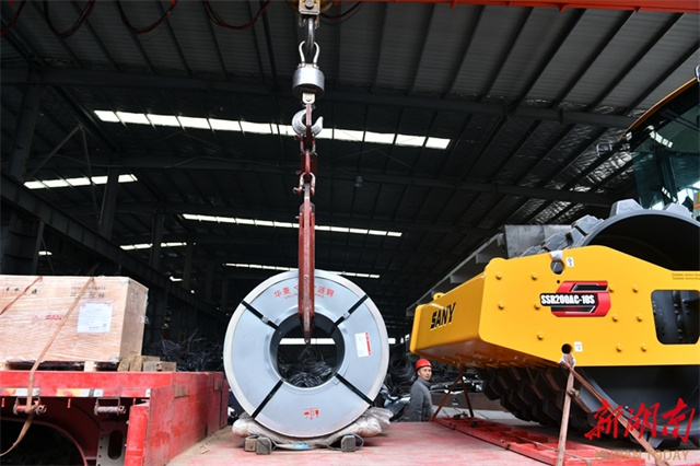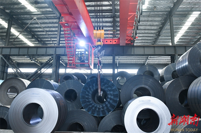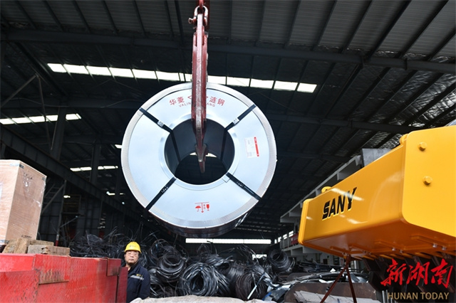The photo taken on December 8 shows a crane lifting heavy steel coils at the production workshop of a technology company in Loudi Economic and Technological Development Zone. In recent years, spearheaded by the goal of building a "Materials Valley" in central China, the city has promoted the development of industrial chains and clusters, establishing a complete industrial ecosystem spanning from new steel materials, scrap steel recycling and deep processing to the manufacturing of components and high-end equipment. (Photo/Wu Yonghua)