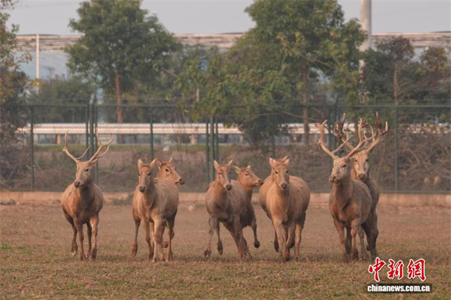 Rescued Milu deer run in the park. (Photo/Yang Huafeng, Xinhua)