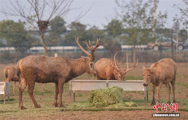Rescued Milu deer feed in the park. (Photo/Yang Huafeng, Xinhua)