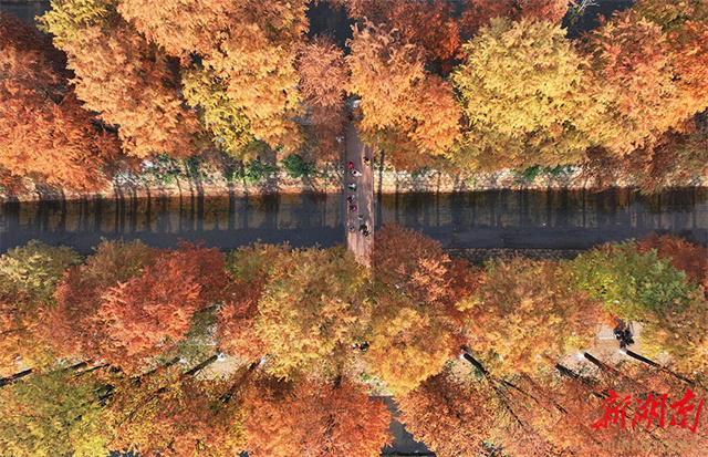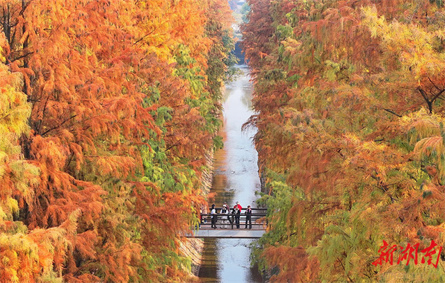 The photo shows visitors strolling through a metasequoia forest in Longqiao Village, Yueping Town, Yanfeng District, Hengyang City. The metasequoias trees here have recently donned beautiful colors, presenting a picturesque scene under the warm winter sun and attracting numerous visitors to experience the beauty of nature. (Photo/Cao Zhengping and Zhou Zhonghui)