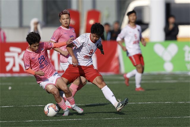 On the evening of December 14, football players engaged in a fierce competition at Changsha Helong Sports Center. On the same day, the first knockout round of the 2025 Hunan Football League kicked off. Changsha team (in red), the home team, defeated Yueyang team 2-0 to advance into the semifinals alongside Changde, Yongzhou, and Zhuzhou teams. (Photo/Guo Liliang, Hunan Daily)