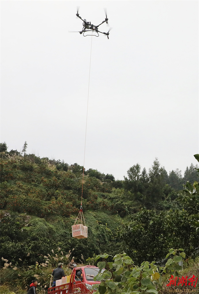 Fruit farmers use a drone to transport navel oranges at Nuoli Village, Qingshuiping Town, Baojing County on December 15. Navel oranges are in season currently. The county authority has organized a drone transport team to move the fresh oranges out of the mountains in an efficient way. This initiative aims to reduce labor cost, enhance transport efficiency, and support the navel orange industry development. (Photo/Yu Caihua and Tang Chaoying)