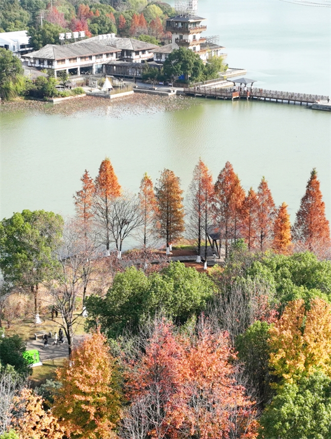 The photo, taken on December 13, shows red, yellow, and green leaves reflected in the clear lake, creating a picturesque scene of harmonious coexistence between humanity and nature. (Photo/Li Jian, Hunan Daily)