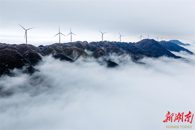 The photo shows wind turbines standing atop rolling mountains at Xiangshouping Wind Farm in Tongdao Dong Autonomous County. In recent years, the county has leveraged its alpine wind power resources to develop clean energy, achieving a win-win balance between economic benefit and ecological protection. (Photo/Shi Menglei)
