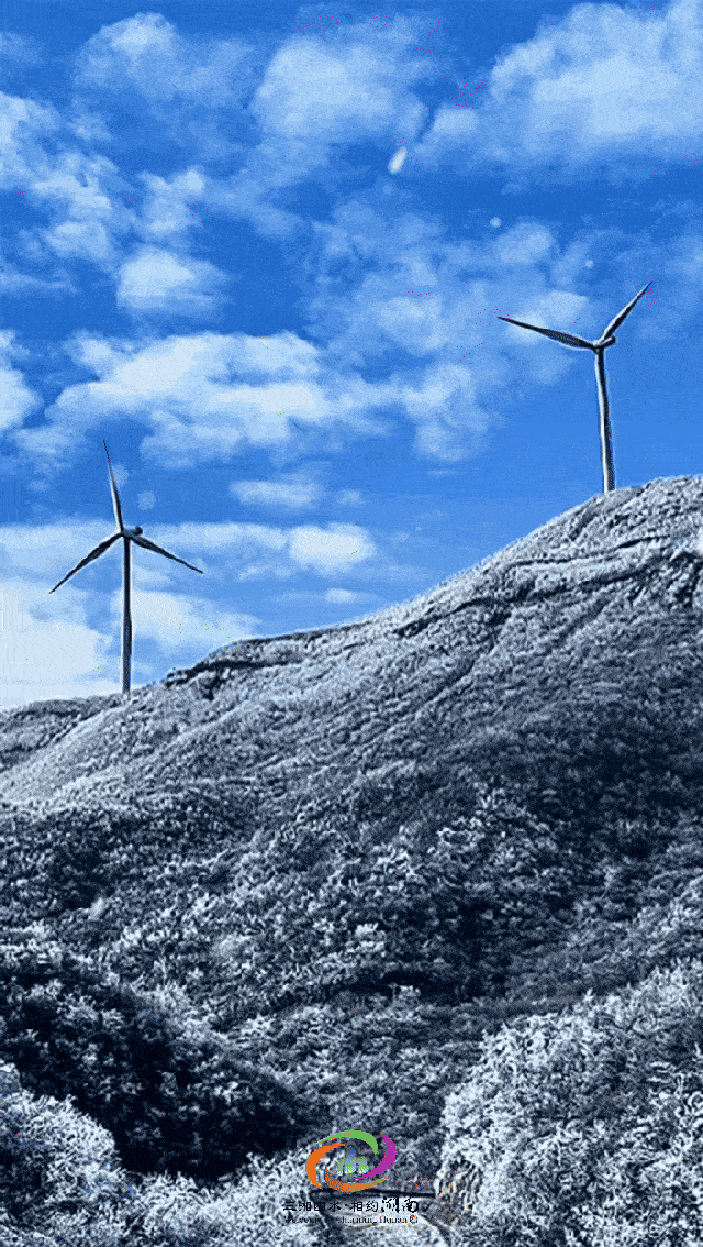At the summit over 1,800 meters above sea level, white wind turbines turn slowly amidst the rime ice. Here, the colossal structures of modern industry meet nature's crystalline landscape, presenting a unique ecological panorama on Yaoshan.