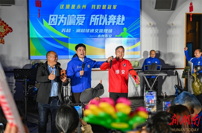 On January 8, fans from Jiangsu's "Suchao League" and the Hunan Football League gathered in Dong'an County, Yongzhou for an exchange event. The local and visiting fans got together to experience traditional culture and folk customs of the county, enjoying an in-depth communication themed "Building Friendships Through Sports and Culture." The photo shows the football fans from Jiangsu Province and Yongzhou City enjoying the gathering at the Juyuan Ecological Cultural Park in Dong'an County on that evening. (Photo/Guo Liliang, Hunan Daily)