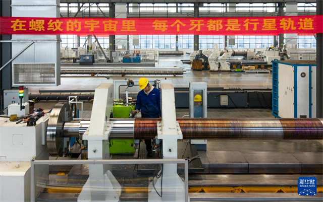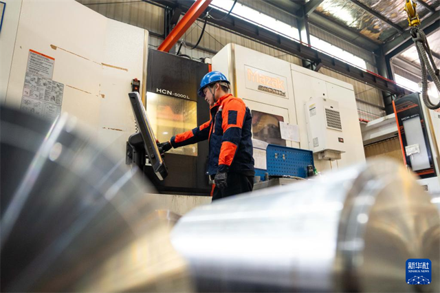 The photo, taken on January 14, shows a worker producing sliding bearings for wind turbines at a company in the Changde High-Tech Industrial Development Zone. (Photo/Chen Sihan, Xinhua)