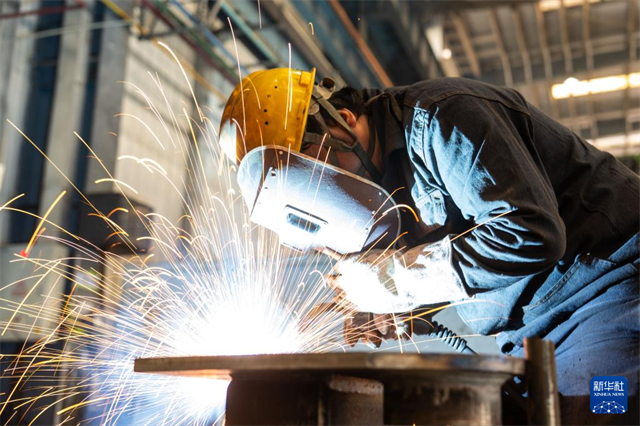 The photo, taken on January 14, shows a worker manufacturing tower crane components at the Zoomlion Construction Hoisting Machinery Co., Ltd. in the Changde High-Tech Industrial Development Zone. (Photo/Chen Sihan, Xinhua)
