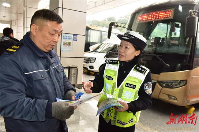 The photo, taken on February 2, shows a traffic police giving out circulars on traffic security at the Chenzhou Bus Terminal.