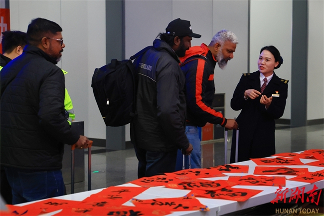 The photo, taken on February 2, shows a railway staff member presenting spring couplets and Chinese calligraphic works with "福" character to foreign travelers at the Huaihua South Railway Station.