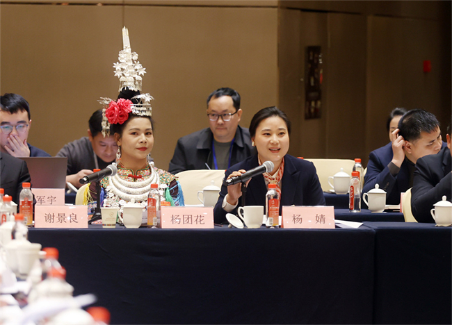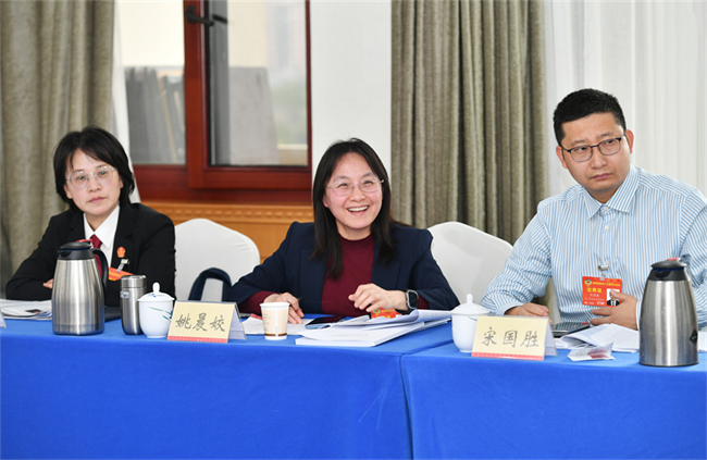 On February 3 afternoon, Yang Jing, a deputy from the Huaihua delegation, suggests on optimizing the business environment and promoting Hunan products to the overseas market. (Photo/Zhao Chi, Hunan Daily)