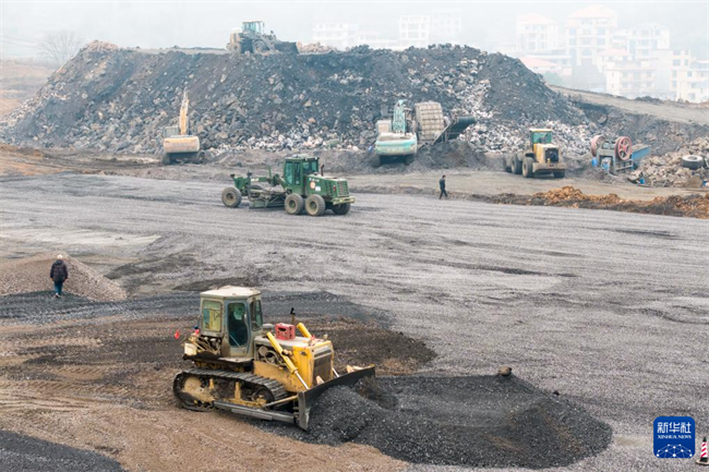 The photo shows workers from the China Railway No. 4 Engineering Group leveling the land at the construction site of the Shaoyang County Railway Station along the Shaoyang-Yongzhou High-speed Railway. (Photo/Chen Sihan, Xinhua)